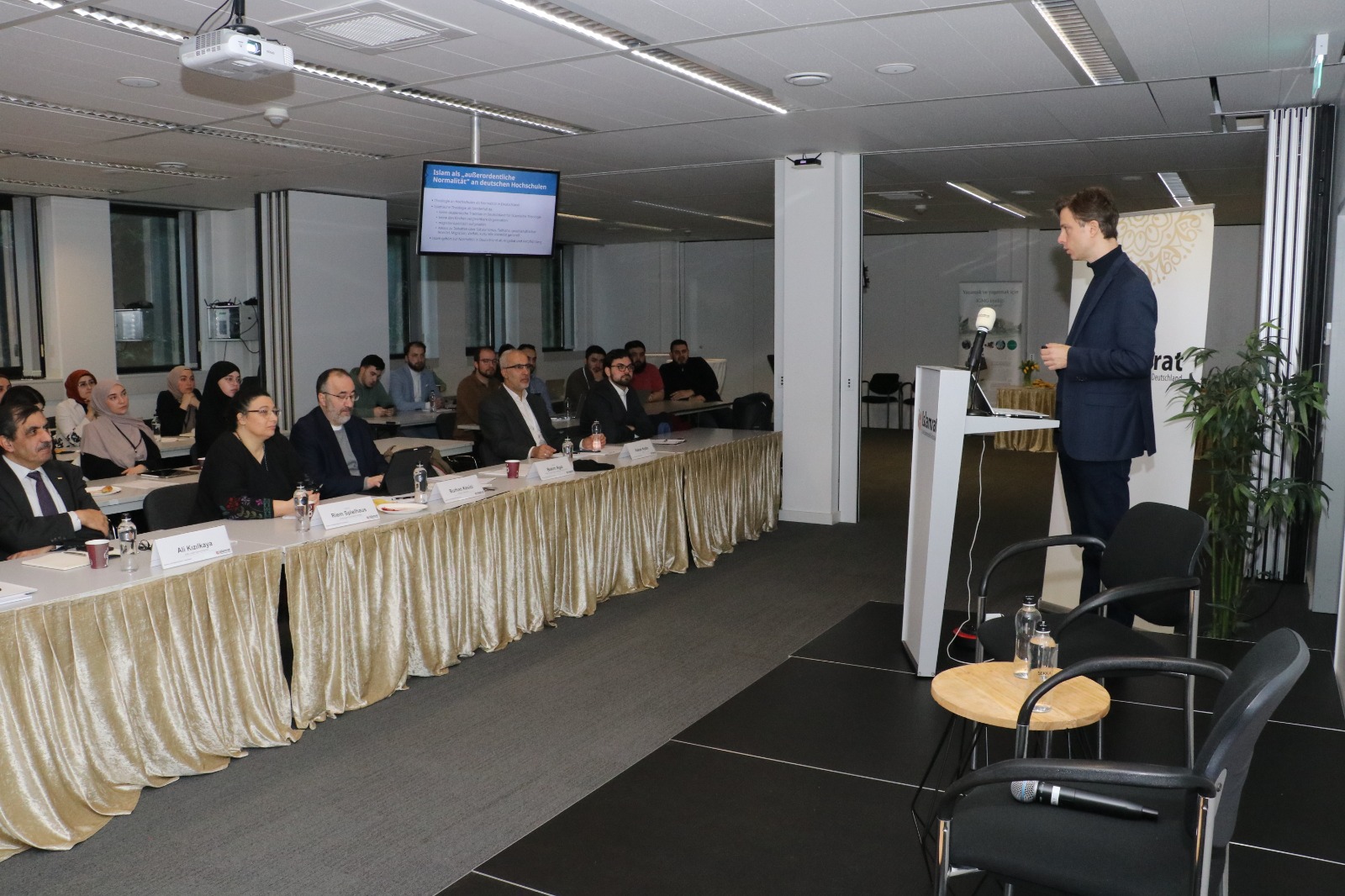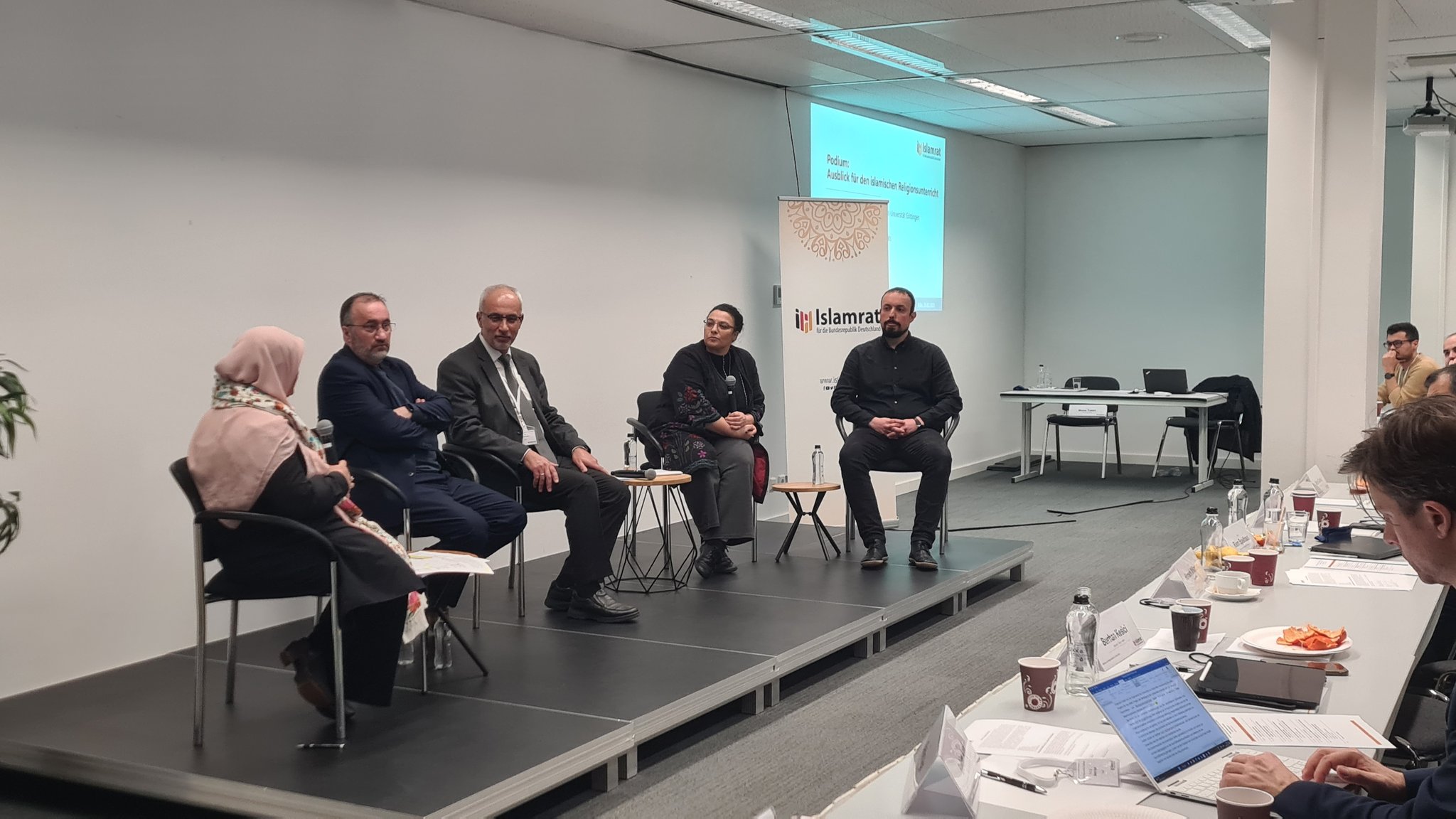 Auf dem anschließenden Podium berichteten Burhan Kesici, IRU-Lehrer in Berlin und ehemaliges Beiratsmitglied für den Religionsunterricht in Nordrhein-Westfalen, und Emin Yılancı, IRU-Lehrer in Aachen, über ihre Erfahrungen im und mit dem Beirat für den islamischen Religionsunterricht in NRW und aus ihrer Lehrpraxis. Dabei ging es um die Gründung und Funktion des Beirats und um das Vergabeverfahren der sogenannten Idschaza, der Lehrerlaubnis für den islamischen Religionsunterricht. Kesici und Yılancı berichteten über positive Entwicklungen wie Herausforderungen im Lehralltag.